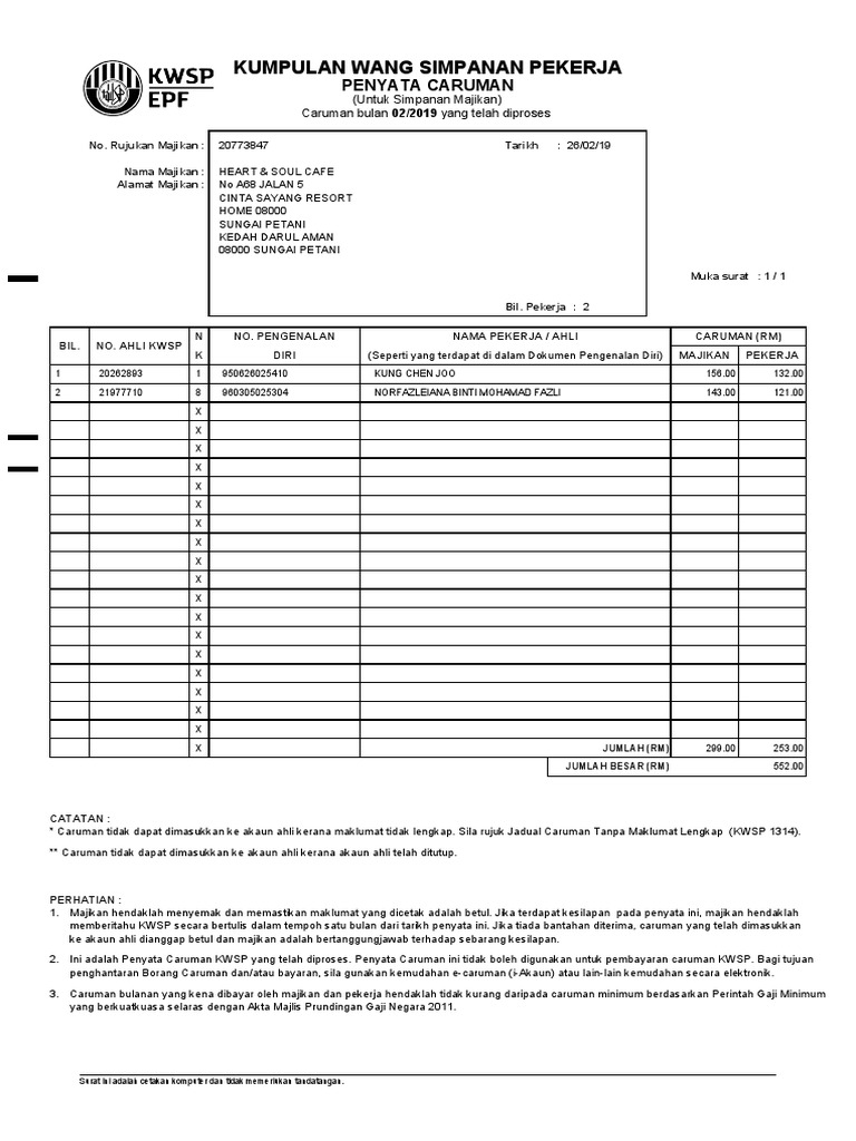 Hubungi KWSP di 03-8922 6000 untuk meminta Kod Pengaktifan anda. Bagi pertukaran nama dan status contoh daripada Pemilik Tunggal kepada Perkongsian majikan hendaklah memaklumkan kepada KWSP dalam tempoh 21 hari dengan menggunakan Borang KWSP 1 MAJ. 11 Hadir Ke Pejabat KWSP.